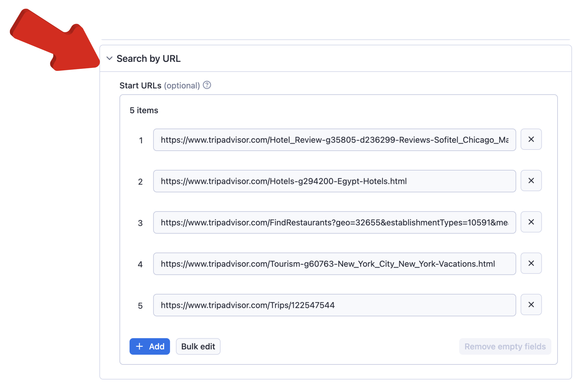 json { "startUrls":[ "https://www.tripadvisor.com/Hotel_Review-g35805-d236299-Reviews-Sofitel_Chicago_Magnificent_Mile-Chicago_Illinois.html", "https://www.tripadvisor.com/Hotels-g294200-Egypt-Hotels.html" ], "search": "New York", "checkInDate": "2025-01-01", "checkOutDate": "2025-10-01", "includeAttractions": true, "includeRestaurants": true, "includeHotels": true, "language": "en", "currency": "USD", "maxItems": 100, "endPage": 1, "extendOutputFunction": "($) => { return {} }", "customMapFunction": "(object) => { return {...object} }", "proxy": { "useApifyProxy": true } } ### Compute Unit Consumption The actor is optimized to run blazing fast and scrape as many items as possible. Therefore, it forefronts all the detailed requests. If the actor doesn't block very often it'll scrape 100 listings in 20 seconds with ~$0.005-$0.006 compute units. ## Bugs, fixes, updates, and changelog This scraper is under active development. If you have any feature requests you can create an issue from here. ## During the Run During the run, the actor will output messages letting you know what is going on. Each message always contains a short label specifying which page from the provided list is currently specified. When items are loaded from the page, you should see a message about this event with a loaded item count and total item count for each page. If you provide incorrect input to the actor, it will immediately stop with a failure state and output an explanation of what is wrong. ## Output ### Restaurant json { "id": "1049685", "type": "restaurant", "category": "restaurant", "subcategories": [ "Sit down" ], "name": "Benoit New York", "locationString": "New York City, New York", "description": "Restaurant, Wine Bar & Private Dining - Open since 2008, Benoit New York is the third member of internationally-acclaimed Chef Alain Ducasse's Benoit family - which also includes the bistro in Paris since 1912 and Benoit Tokyo. In New York, guests enjoy a warm and authentic experience and a menu filled with traditional bistro dishes with a modern flair. In August 2016, the restaurant underwent a renovation, bringing a contemporary New York City touch to the classic French restaurant.", "image": "https://media-cdn.tripadvisor.com/media/photo-o/0d/7c/2f/fb/hors-d-oeuvre.jpg", "photoCount": 383, "awards": [], "rankingPosition": 627, "rating": 4, "rawRanking": 4.039697647094727, "phone": "+1 646-943-7373", "address": "60 W 55th St Between Fifth & Sixth Aves, New York City, NY 10019-5308", "addressObj": { "street1": "60 W 55th St", "street2": "Between Fifth & Sixth Aves", "city": "New York City", "state": "NY", "country": "United States", "postalcode": "10019-5308" }, "localName": "Benoit New York", "localAddress": "60 W 55th St, Between Fifth & Sixth Aves, 10019-5308", "localLangCode": "en-US", "email": "bistrot@benoitny.com", "latitude": 40.76269, "longitude": -73.97744, "webUrl": "https://www.tripadvisor.com/Restaurant_Review-g60763-d1049685-Reviews-Benoit_New_York-New_York_City_New_York.html", "website": "http://www.benoitny.com/", "rankingString": "#627 of 14,183 places to eat in New York City", "rankingDenominator": "8205", "neighborhoodLocations": [ { "id": "7102352", "name": "Midtown" } ], "nearestMetroStations": [ { "name": "57th St", "localName": "57th St", "address": "1392-1394 6th Ave, Long Island City, NY 10019", "localAddress": "1392-1394 6th Ave, 10019", "lines": [ { "id": "new-york-new-york-city-subway-f", "lineName": "F", "lineSymbol": "https://static.tacdn.com/img/api/metro_stations/metro_placeholder.png", "systemName": "NYC Subway", "systemSymbol": "https://static.tacdn.com/img/api/metro_stations/metro_placeholder.png", "type": "Rapid Transit" } ], "latitude": 40.76396942138672, "longitude": -73.97745513916016, "distance": 0.08839800240055308 } ], "ancestorLocations": [ { "id": "60763", "name": "New York City", "abbreviation": null, "subcategory": "City" } ], "ratingHistogram": { "count1": 35, "count2": 47, "count3": 128, "count4": 301, "count5": 470 }, "numberOfReviews": 981, "priceLevel": "$$$$", "priceRange": "$25 - $100", "cuisines": [ "French", "Contemporary" ], "mealTypes": [ "Lunch", "Dinner" ], "dishes": [ "Baguette", "Filet Mignon", "Lobster" ], "dietaryRestrictions": [ "Vegetarian Friendly", "Gluten Free Options" ], "establishmentTypes": [ "Restaurants" ], "menuWebUrl": "https://www.benoitny.com/menus", "isClosed": false, "isLongClosed": false, "hours": { "weekRanges": [ [ { "open": 720, "openHours": "12:00", "close": 1260, "closeHours": "21:00" } ] ], "timezone": "America/New_York" }, "booking": { "provider": "OpenTable", "url": "https://www.tripadvisor.com/Commerce?p=OpenTable&src=232171538&geo=1049685&from=api&area=reservation_button&slot=1&matchID=1&oos=0&cnt=1&silo=45582&bucket=979641&nrank=1&crank=1&clt=R&ttype=Restaurant&tm=288266674&managed=false&capped=false&gosox=9DMvibDTWdNaFeGYL8QTakyv1LBYZaGpeB4MEHn-hv2mZBN376EHVCGusTIRxmJ8AObDCfP9_-JSKy-iI9MlddieEOHSA0Xrk7G74dAg8PM&cs=18e91e712bfe3b841eba52767082a89f5" } } ### Hotel json { "id": "262330", "type": "hotel", "category": "hotel", "subcategories": [ "Hotel" ], "name": "Millennium Downtown New York", "locationString": "New York City, New York", "description": "Millennium New York Downtown is located in the heart of the Financial District, just steps from The Oculus, One World Observatory, and the 9/11 Memorial & Museum. Guests love our City View rooms and suites, featuring some of the best views in Lower Manhattan: unobstructed views overlooking the Oculus NYC and One World Trade Center to the West, and the iconic Woolworth Building and Brooklyn Bridge in East-facing rooms. With 11 subway stops within a block of the property and ferry access just a 10 minute walk away, we're also one of the most convenient hotels in the city, offering easy access to Times Square, Madison Square Garden, Downtown Brooklyn, and all 5 boroughs. Iconic attractions like Wall Street, City Hall, Brooklyn Bridge, and the South Street Seaport are within a 