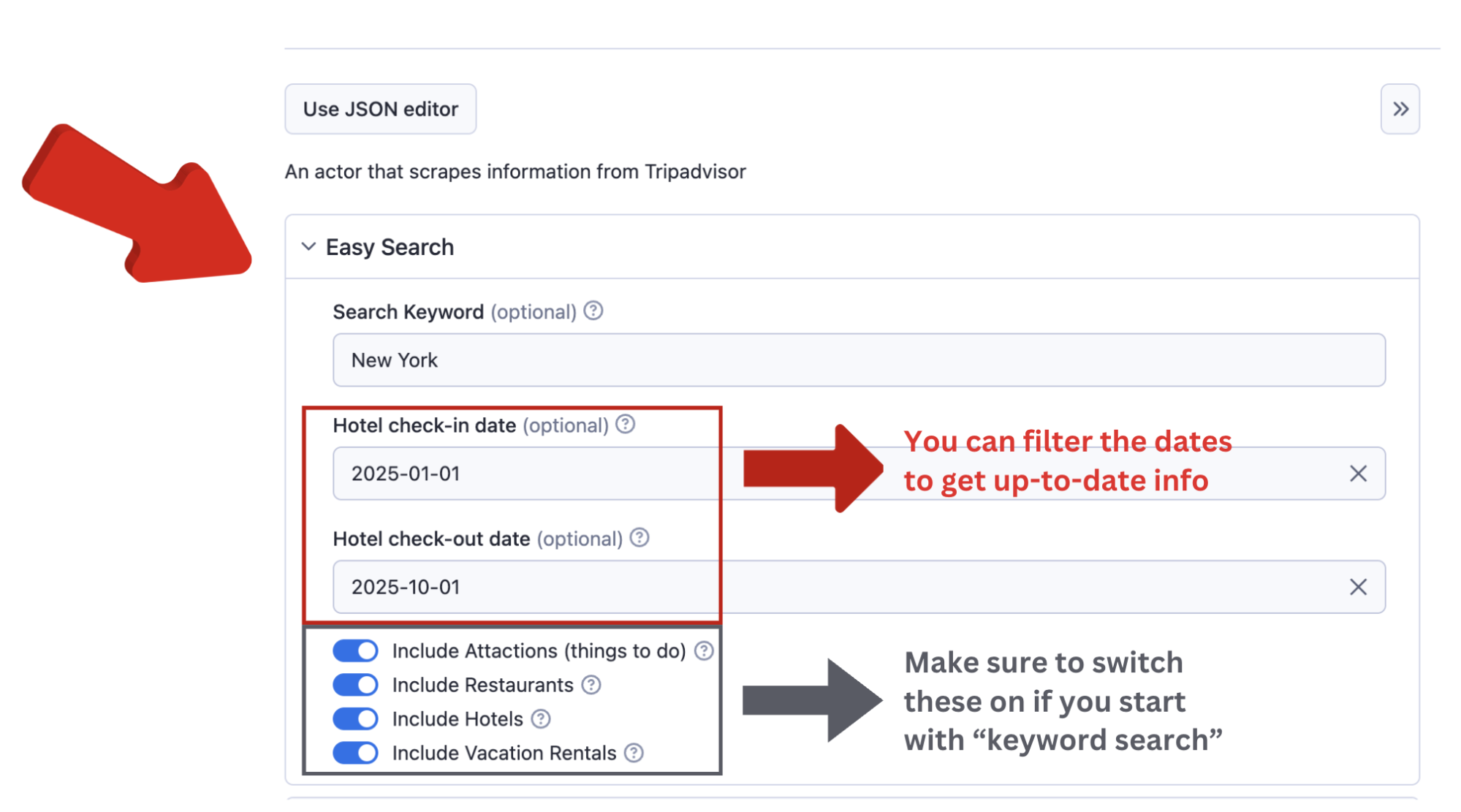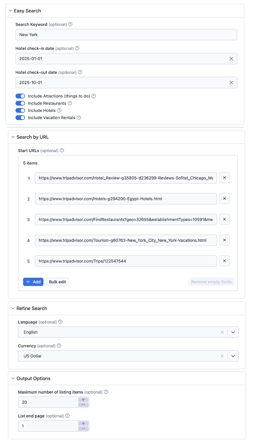### Input Parameters Explained The input of this scraper should be JSON containing the list of pages on TripAdvisor that should be visited. Required fields are: - search: (Optional) (String) A string specifying the name of a location for a Tripadvisor search, such as a country, city, or neighborhood. The scraper selects the first 'Location' type result based on this input. - checkInDate: (Optional) (String) The hotel check-in date to view specific offers. Leave blank to see default offers. - checkOutDate: (Optional) (String) The hotel check-out date for precise offer durations. - includeAttractions: (Optional) (Boolean) Search will include the attractions. - includeRestaurants: (Optional) (Boolean) Search will include the restaurants. - includeHotels: (Optional) (Boolean) Search will include the hotels. - startUrls: (Optional) (Array) List of TripAdvisor URLs. You should only provide TripAdvisor list or detail URLs. - language: (Optional) (String) Language for the TripAdvisor to change the results accordingly. - currency: (Optional) (String) Currency for the TripAdvisor to change the results accordingly. - endPage: (Optional) (Number) Final number of page that you want to scrape. The default is Infinite. This applies to all search requests and startUrls individually. - maxItems: (Optional) (Number) You can limit scraped items. This should be useful when you search through the big lists or search results. - proxy: (Required) (Proxy Object) Proxy configuration. - extendOutputFunction: (Optional) (String) A function that takes a JQuery handle ($) as an argument and returns an object with data. - customMapFunction: (Optional) (String) A function that takes each object's handle as an argument and returns the object with executing the function. This solution requires the use of Proxy servers, either your own proxy servers or you can use Apify Proxy. ### TripAdvisor Scraper Input Examples