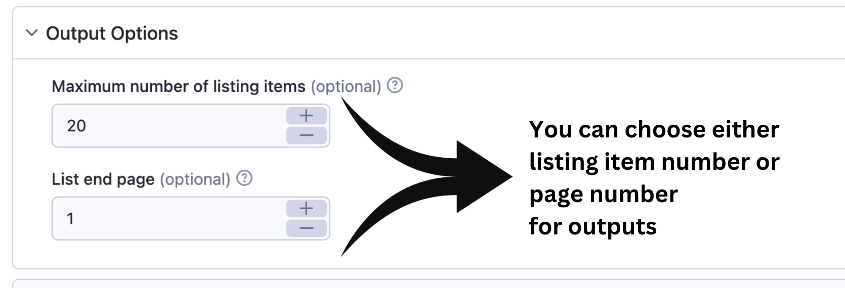 You can limit the number of output results by either writing a number for number of listing items or list end page. π‘If you would like to scrape only the first page of a list then put the link for the page and have the endPage as 1. π‘With the last approach that is explained above you can also fetch any interval of pages. If you provide the 5th page of a list and define the endPage parameter as 6 then you'll have the 5th and 6th pages only.