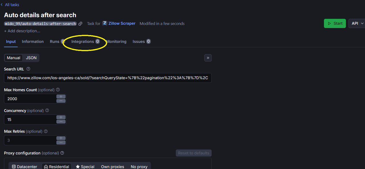 3. Navigate to the "Integrations" tab within your newly created Zillow Scraper task.